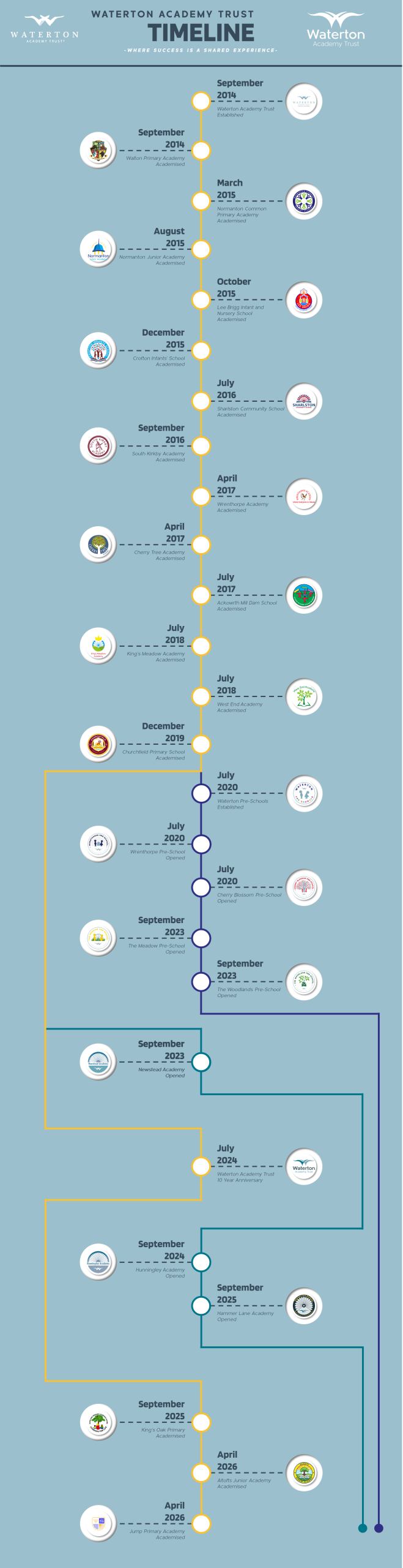 Waterton Academy Trust has undergone significant growth and transformation over the past decade, evolving from a small group of schools into a flourishing family of fourteen academies and four pre-schools. Each school that has joined the Waterton family has contributed its unique strengths, contributing to our dedication to excellence and enriching our collective journey. Over the last ten years, we have prioritised collaboration, innovation, and continuous improvement, ensuring that every school within our Trust is supported in achieving the best possible outcomes for its pupils. This page offers an overview of our Trust’s development, highlighting key milestones and the schools that have become part of our journey.